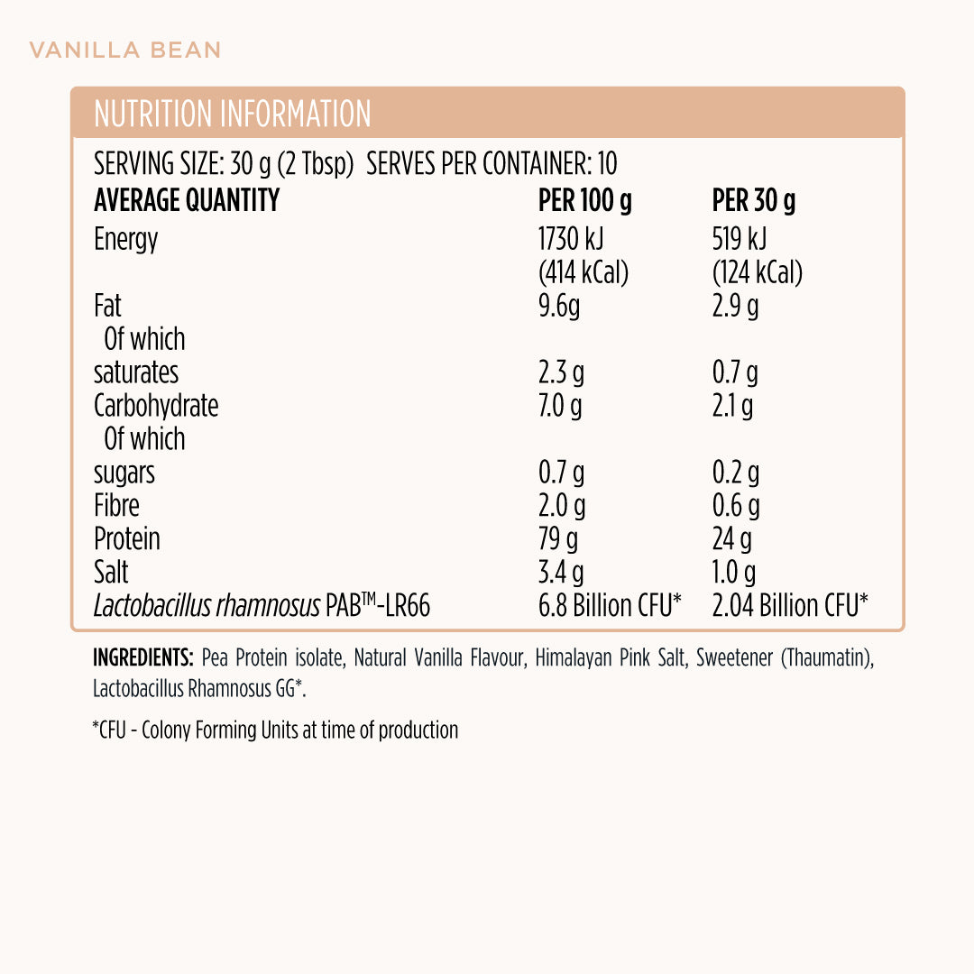Vanilla Bean: Pea Protein isolate, Natural Vanilla Flavour, Himalayan Pink Salt, Sweetener (Thaumatin), Lactobacillus Rhamnosus GG*.