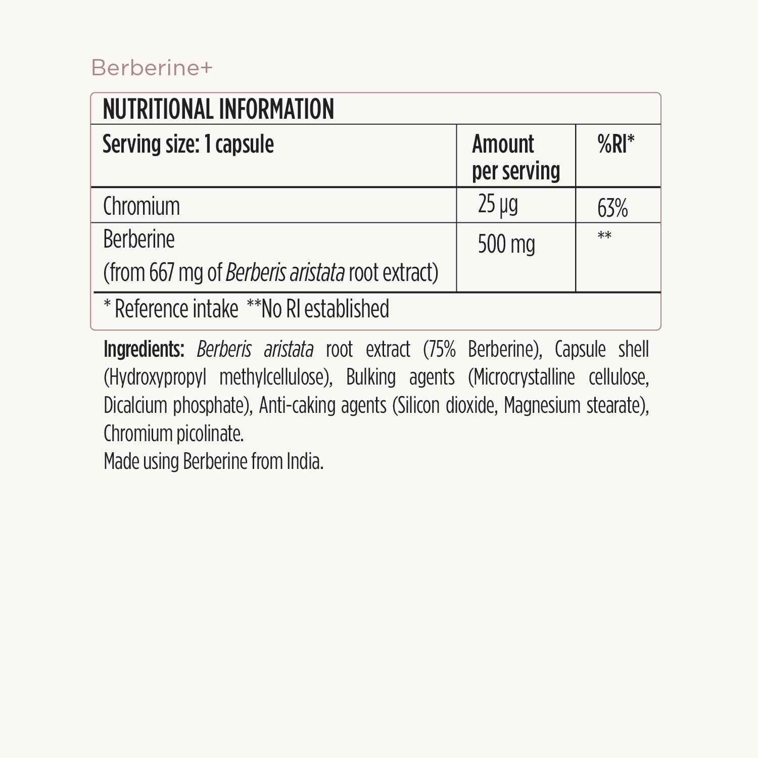 Ingredients: Berberis aristata root extract (75% Berberine), Capsule shell (Hydroxypropyl methylcellulose), Bulking agents (Microcrystalline cellulose, Dicalcium phosphate), Anti-caking agents (Silicon dioxide, Magnesium stearate), Chromium picolinate.