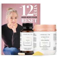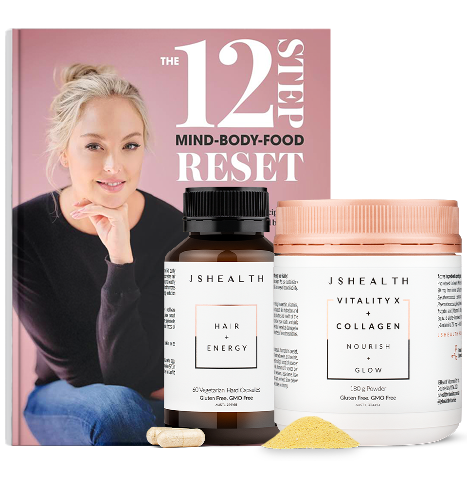 Contains: - Book 3: The 12 Step Mind-Body-Food Reset By Jessica Sepel - Hair + Energy Vitamins 60s - Vitality X + Collagen