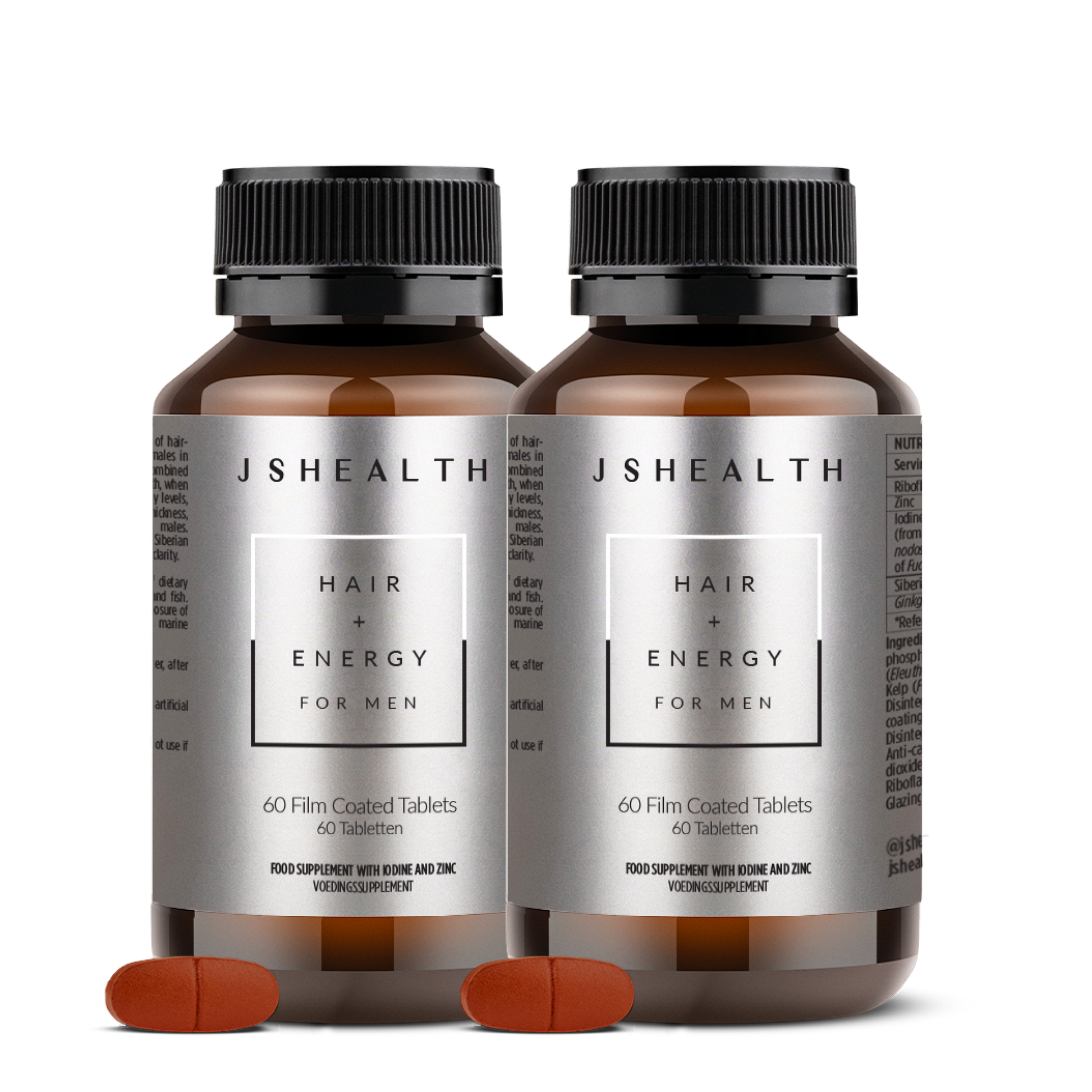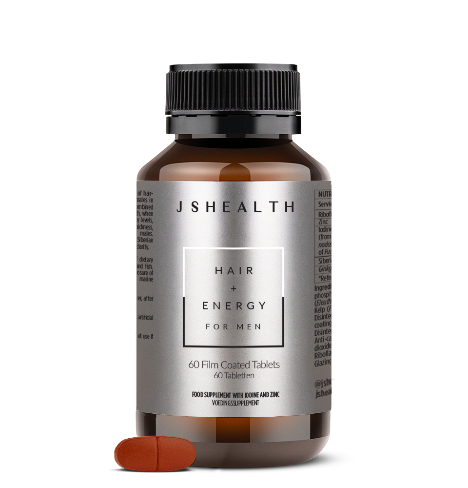 Hair + Energy For Men is built on the same best-selling base formula as our Hair + Energy supplement, now specifically enhanced for male wellness with additional ingredients. It contains our signature JSHealth Kelp™ blend (a complex of two kelp species containing Iodine) to support hair growth and health and specifically-dosed Zinc to support testosterone levels and hair thickness. Additionally, Hair + Energy For Men also contains Siberian Ginseng and Riboflavin to support stamina, physical endurance and energy levels, plus Ginkgo  can contribute healthy blood circulation.
