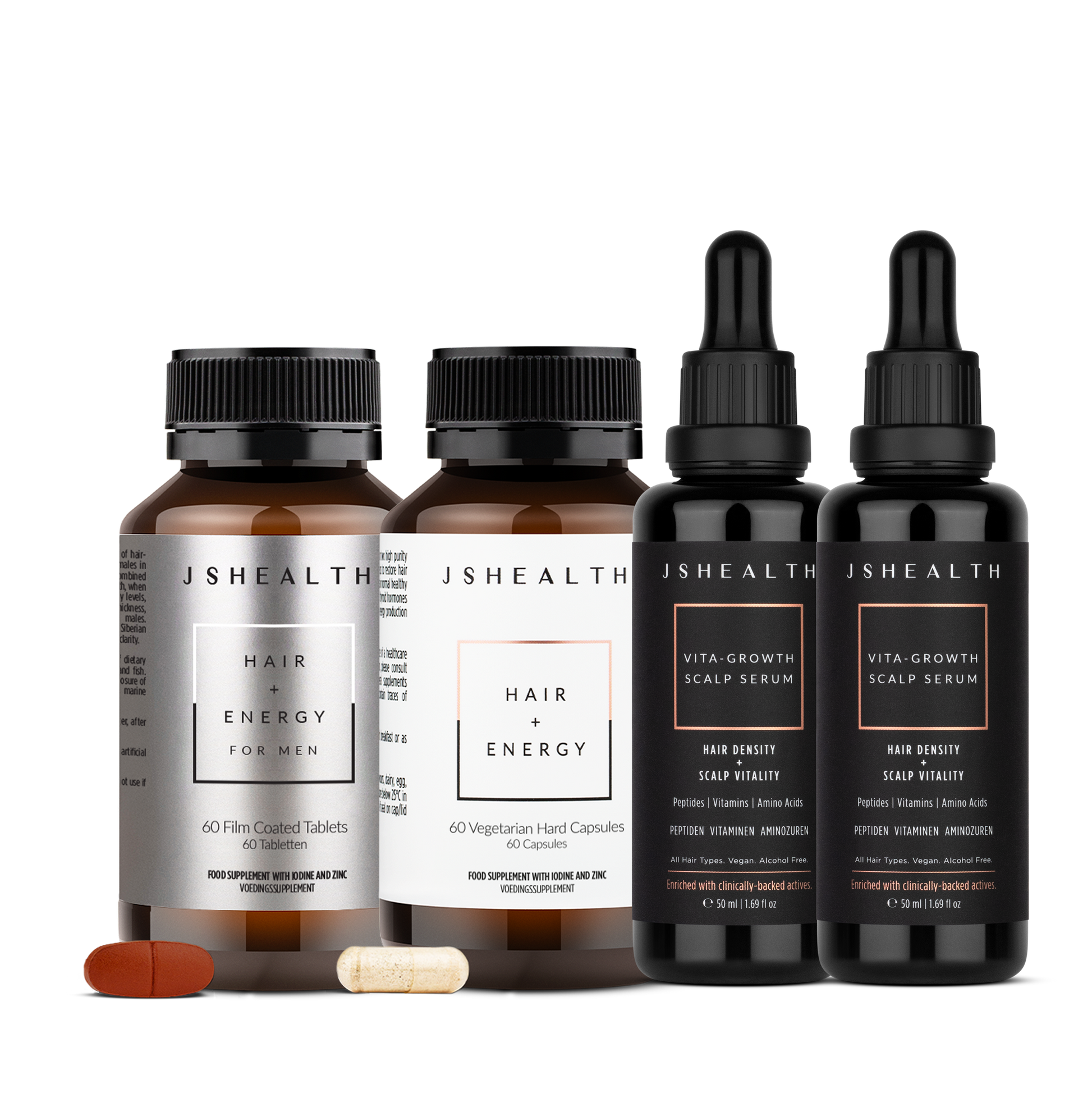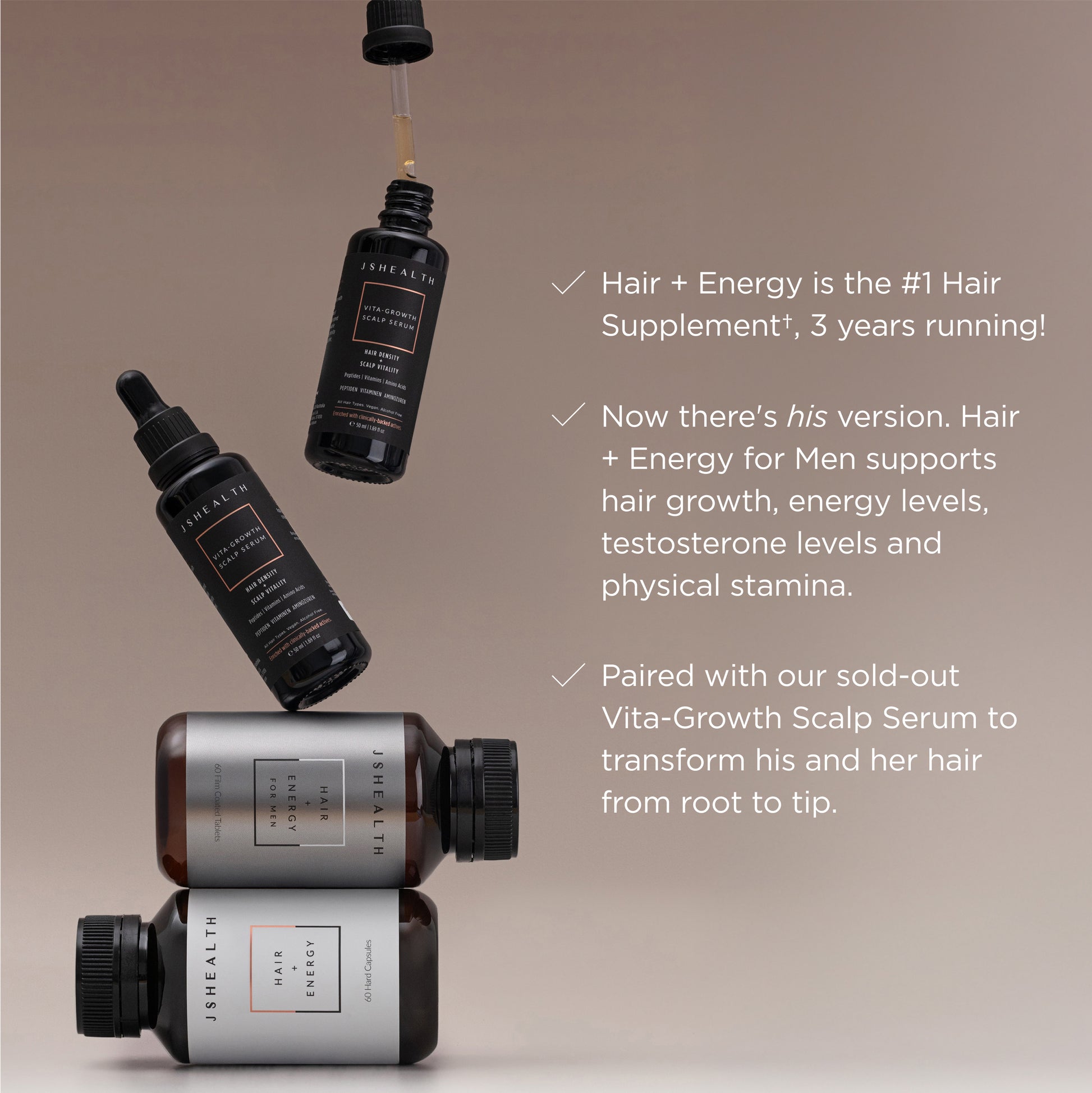 A duo our #1 hair growth formula, Hair + Energy, in his and her versions, alongside two of our twice sold-out, Vita-Growth Scalp Serums for transformational results.