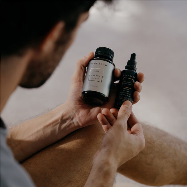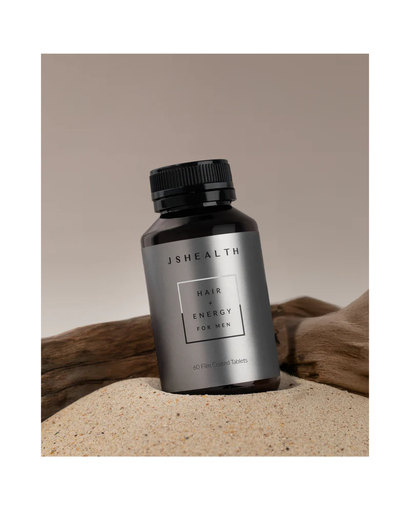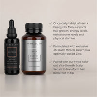 Hair + Energy For Men is built on the same best-selling base formula as our Hair + Energy supplement, now specifically enhanced for male wellness with additional ingredients. It contains our signature JSHealth Kelp™ blend (a complex of two kelp species containing Iodine) to support hair growth and health and specifically-dosed Zinc to support testosterone levels and hair thickness. Additionally, Hair + Energy For Men also contains Siberian Ginseng and Riboflavin to support stamina, physical endurance and energy levels, plus Ginkgo can contribute healthy blood circulation.
