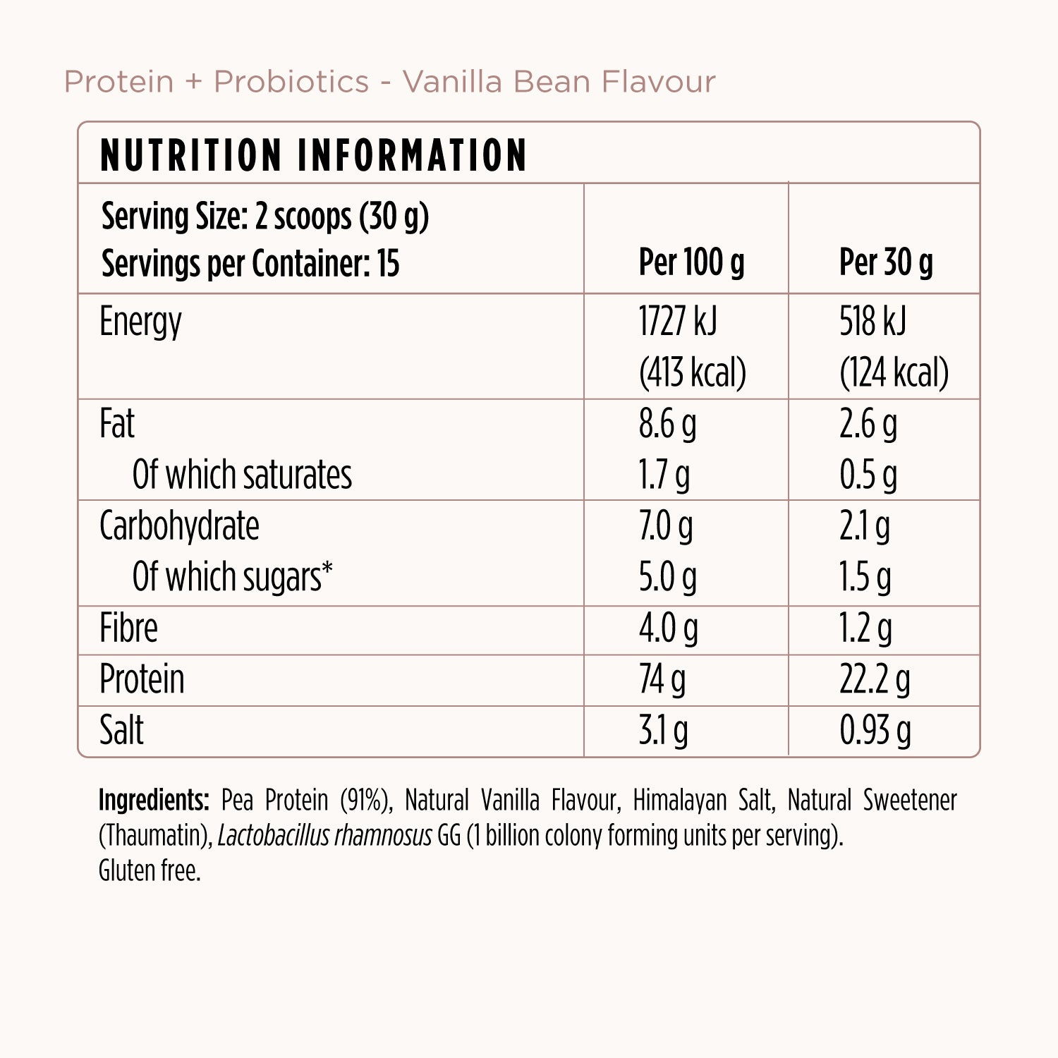 Pea Protein (91%), Natural Vanilla Flavour, Himalayan Salt, Natural Sweetener (Thaumatin), Probiotics ( Lactobacillus rhamnosus GG).