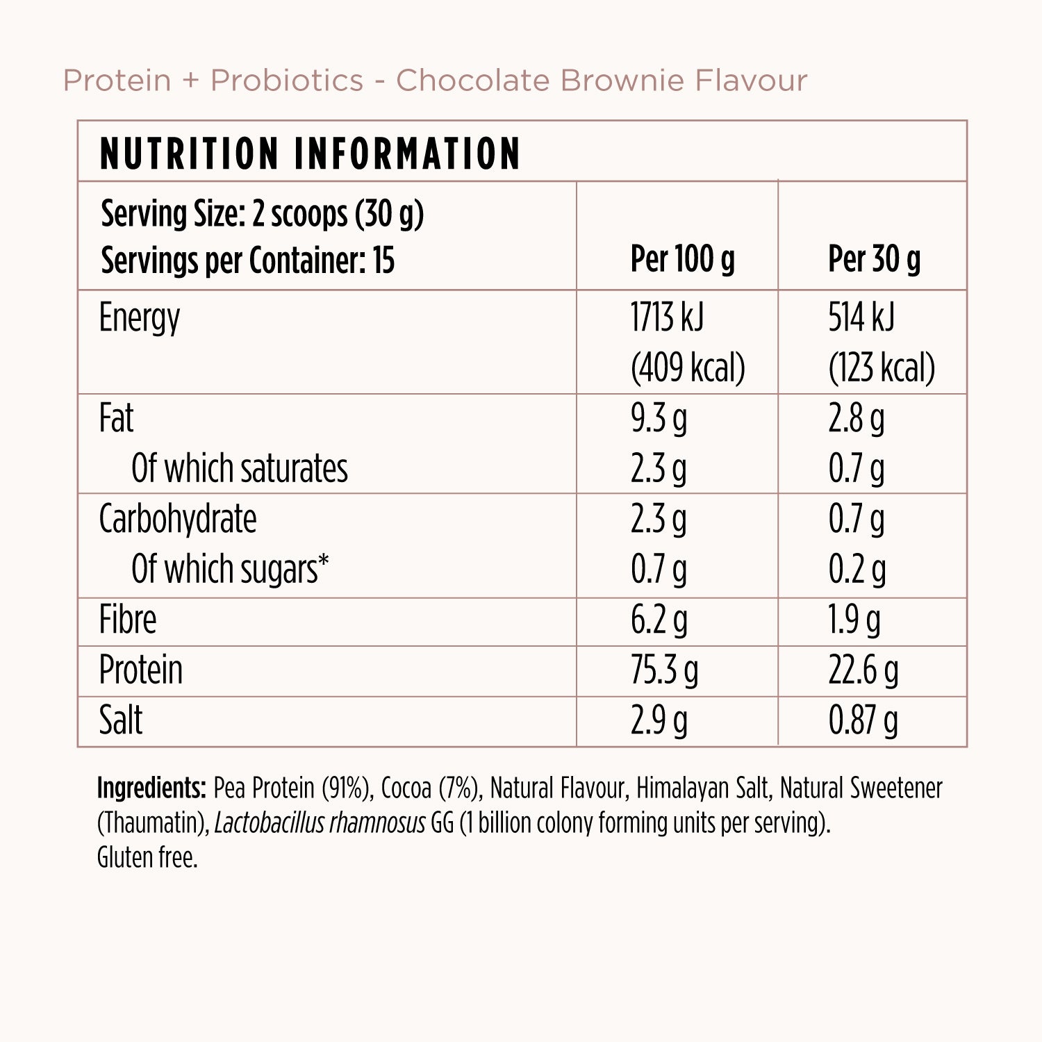 Pea Protein (91%), Cocoa (7%), Natural Flavour, Himalayan Salt, Natural Sweetener (Thaumatin), Probiotics ( Lactobacillus rhamnosus GG).
