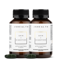 The JSHealth Skin + Digestion formula contains Vitamin B2, Vitamin C, Zinc, Burdock and Turmeric.